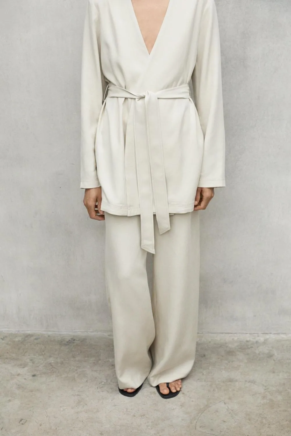 Materiale sostenibile, vestibilità ampia, scollo a V, vita regolabile, spacchi laterali.