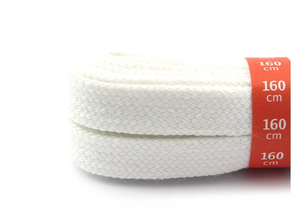 Lacci bianchi piatti in cotone lunghi 120 cm, adatti a sneakers basse e 160 cm, adatti a sneakers alla caviglia.