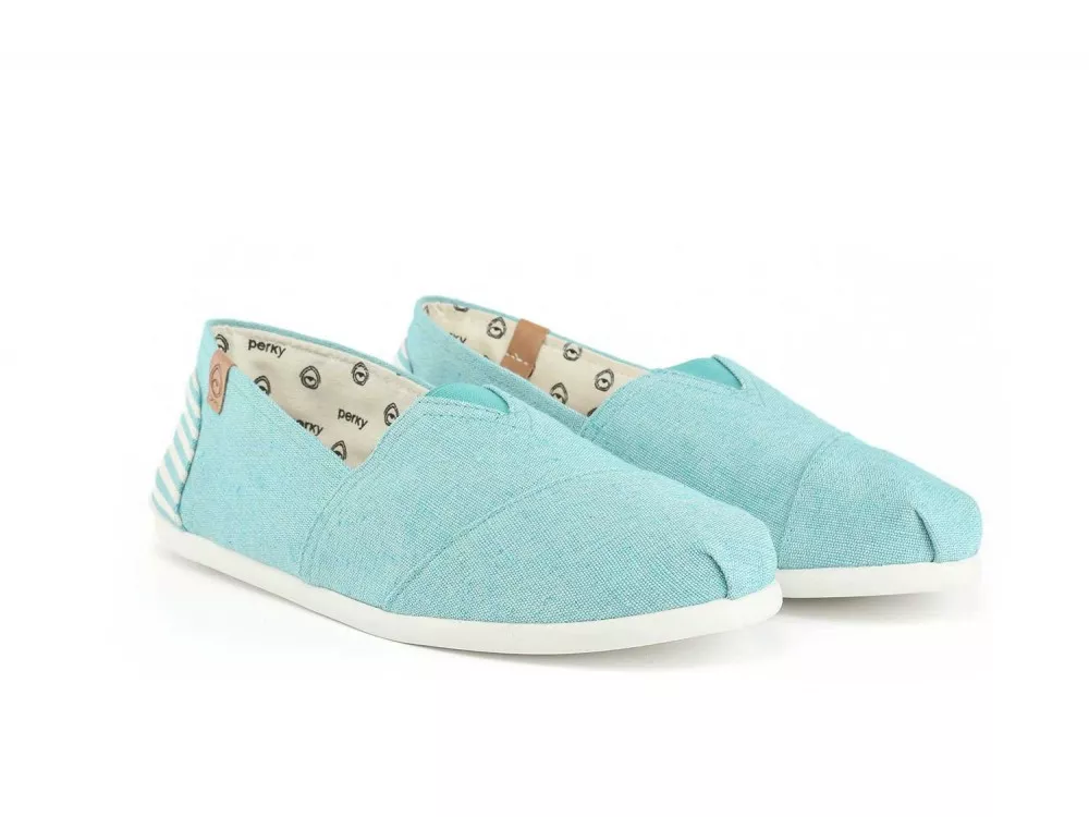 Leggerezza e comodità hanno accompagnato il marchio Perky fin dall'inizio. Il tessuto unico in turchese, accentato con strisce sui tacchi, adornerà i vostri piedi ad ogni passo. Basta infilarli e partire per le avventure estive.