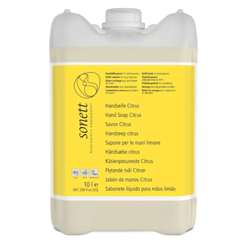 Sonett Liquid Hand Soap - Citrus è un sapone naturale e biologico dal rinfrescante profumo di agrumi, adatto all'uso quotidiano. Grazie alla sua composizione di oli vegetali puri e oli essenziali di agrumi, offre una pulizia delle mani delicata ma efficace, senza seccare la pelle. La confezione grande da 10 litri è ideale per le famiglie e per i locali più grandi, come scuole, uffici, ristoranti o strutture sanitarie, dove sono necessarie ricariche regolari.