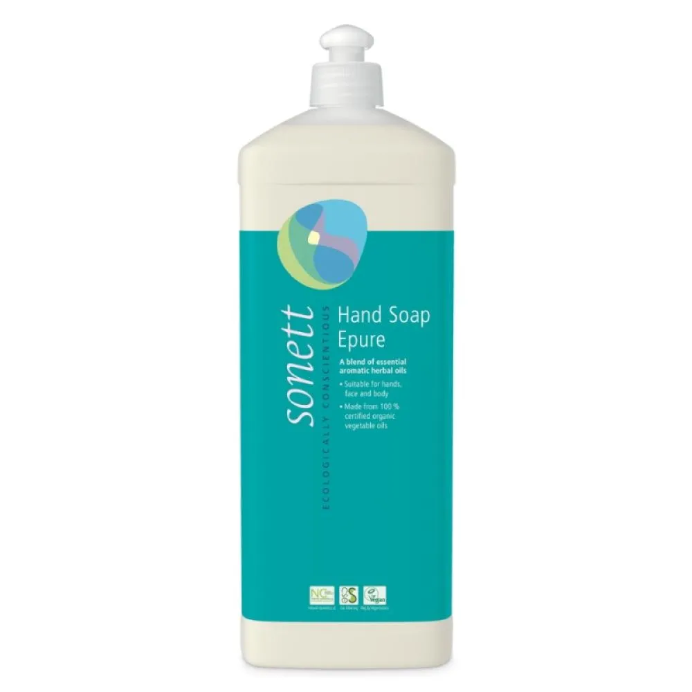 Sonett Liquid Hand Soap - Epure è un sapone naturale, delicato ed ecologico che deterge in modo affidabile la pelle senza seccarla. Grazie alla sua formulazione equilibrata di oli vegetali e ingredienti detergenti naturali, è adatto per il lavaggio quotidiano di mani e corpo. La formula ecologica protegge l'ambiente e la confezione economica da 1 litro offre un ottimo rapporto qualità-prezzo, rendendolo una scelta ideale per le famiglie e le piccole imprese.